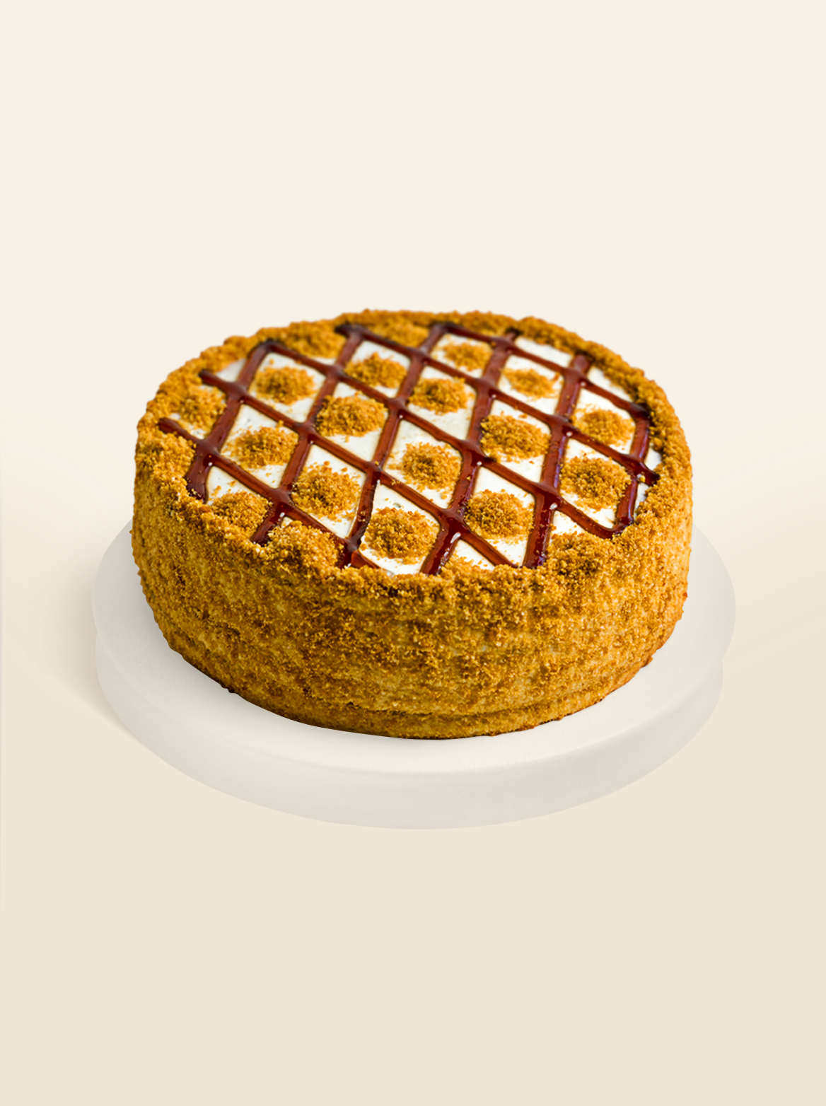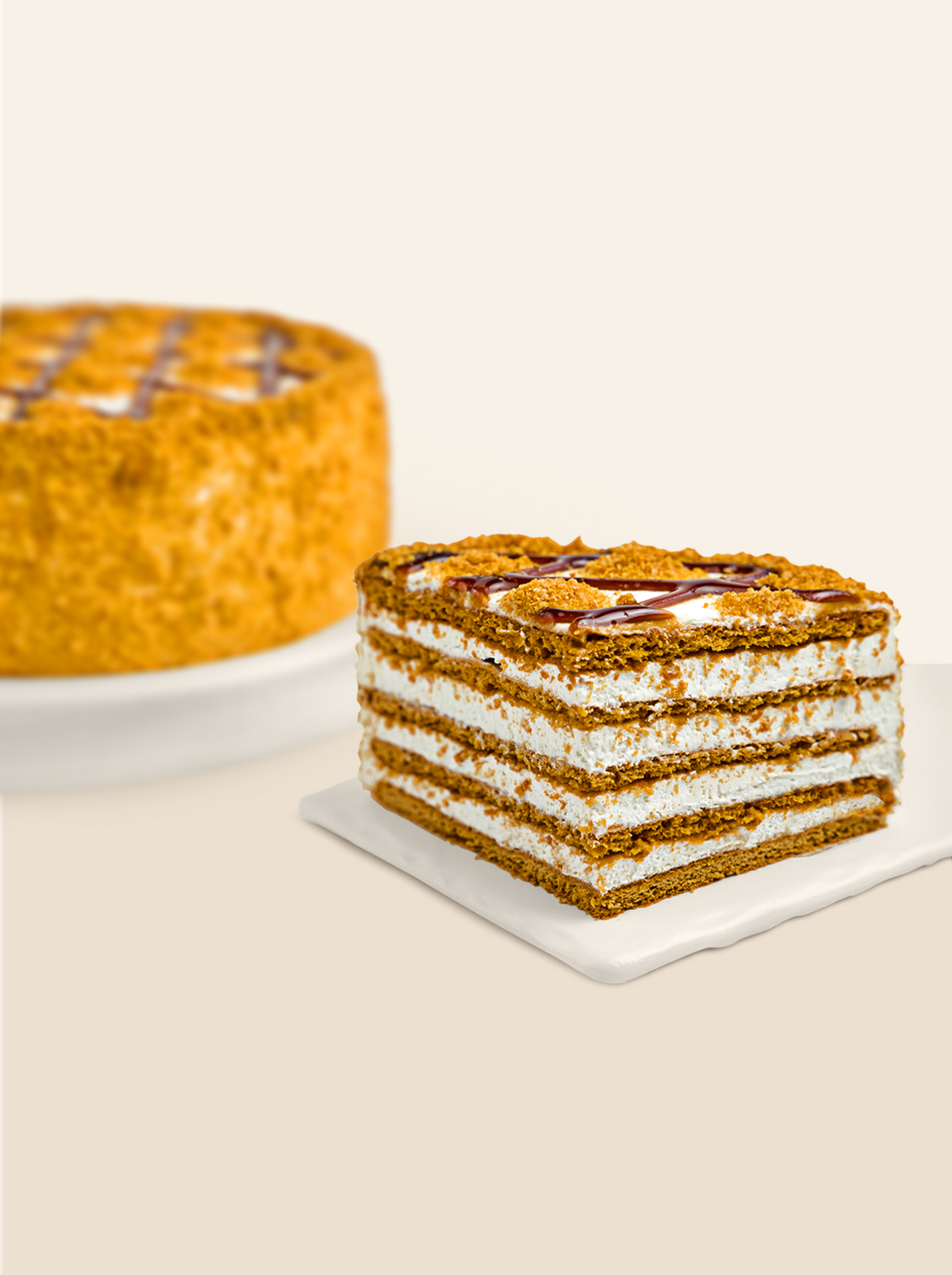 Мука пшеничная хлебопекарная в/с, сметана 20%, сливки натуральные 33-,38%, мед натуральный, сыр «Маскарпоне», масло сливочное 72,5%, сахар-песок, пудра сахарная, яйцо куриное, гель карамельный, коньяк, глазурь шоколадная, сода пищевая, уксус столовый.